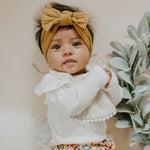Featuring a soft, cable knit pattern, our Matilda Headbands are the statement piece your baby's outfits are missing. Gentle on all hair types, our headbands won't pull your baby girl's hair or feel tight on her head. As your baby girl grows hair, using a headband to keep it out of her face will make her feel comfortable and happy. Our headbands might even simplify your morning routine - throwing a headband on is way easier than tying a ponytail!