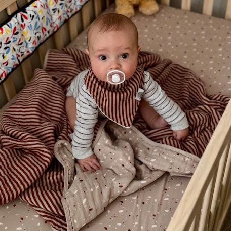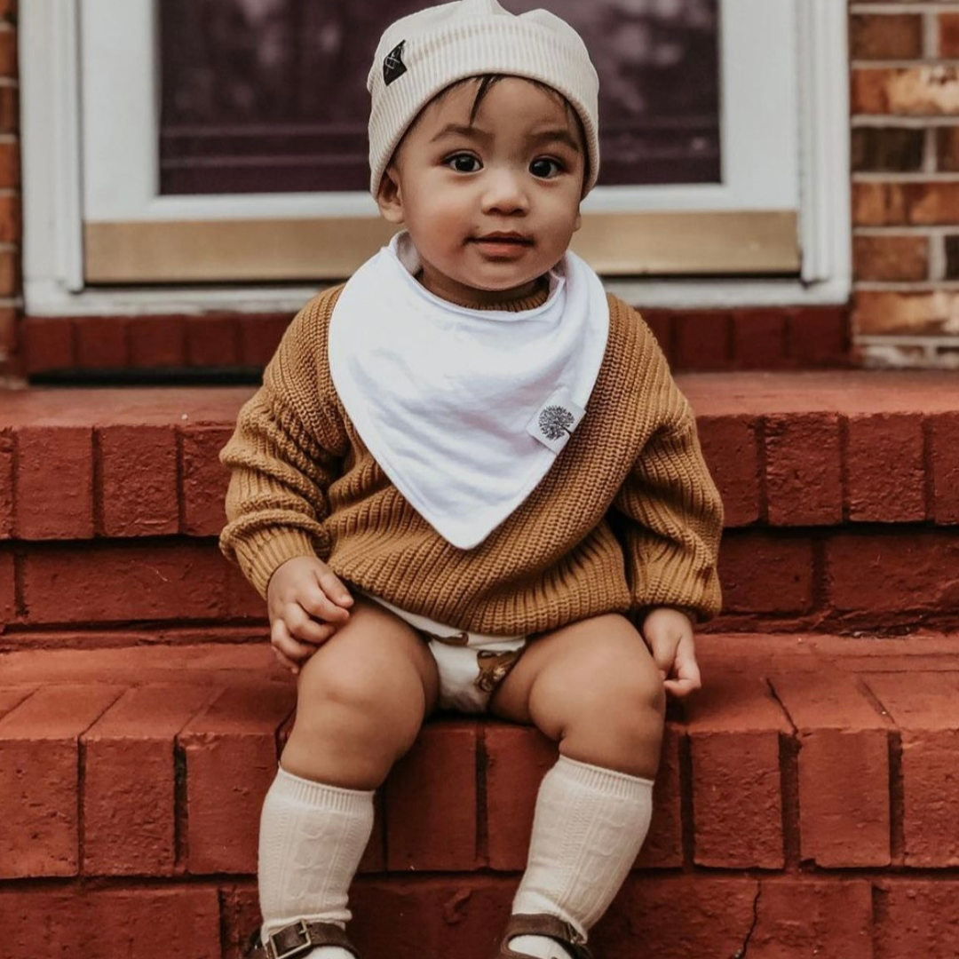 Our Bandana Bibs are designed for babies 3-24 months. An adjustable snap on the back allows each bib to grow with your baby!
