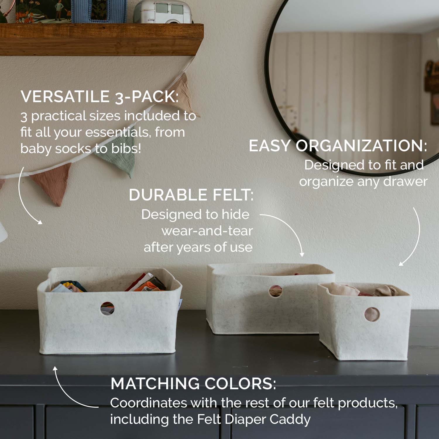 With 3 soft, structured felt bins in versatile sizes, these organizers help you control the chaos — whether you’re a Type A mom who loves a system or a Type B mom who just wants things to stay put.