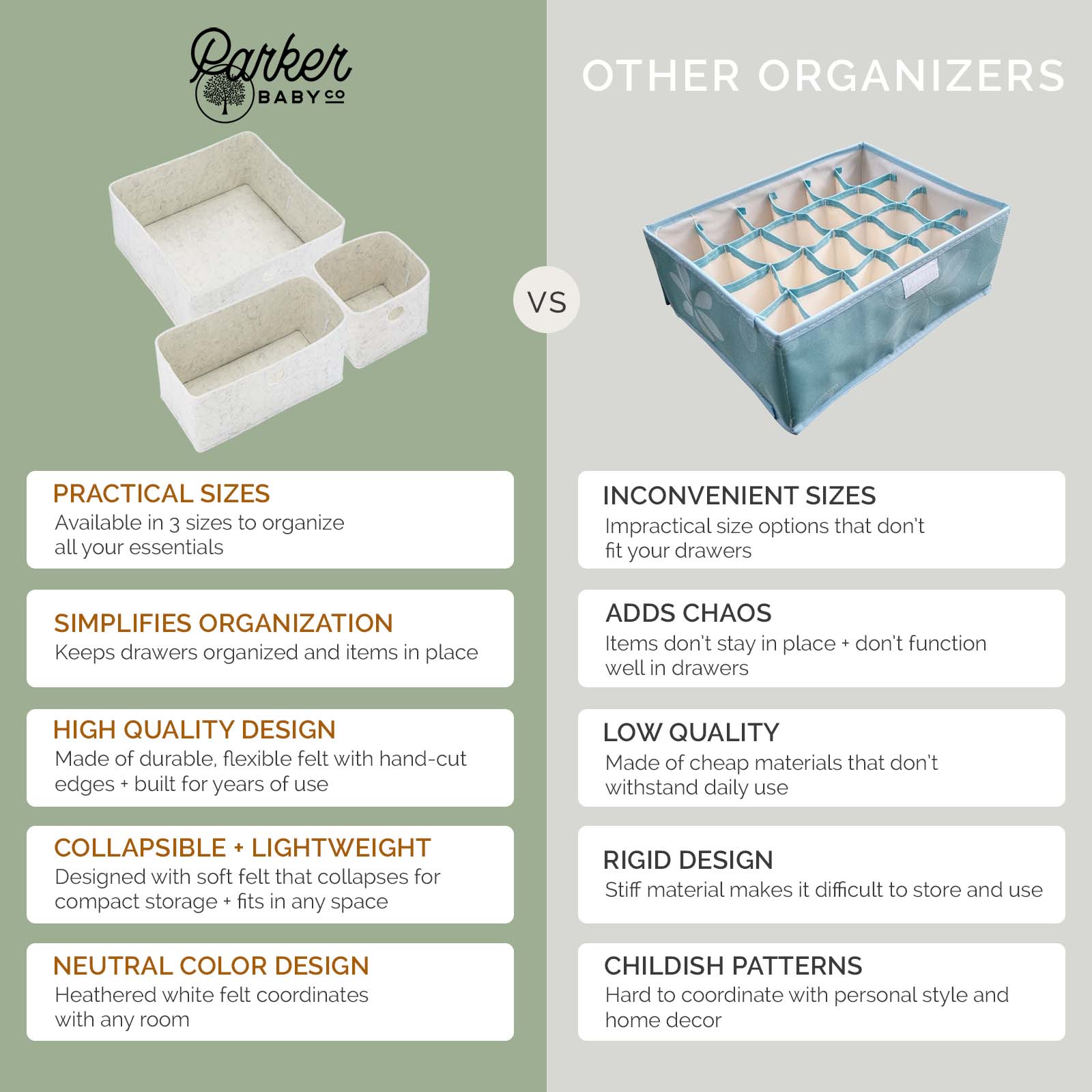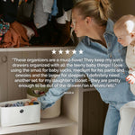Perfect for baby socks, onesies, bibs, diapers, accessories, and more. Works just as well in kids’ rooms and parents’ drawers.