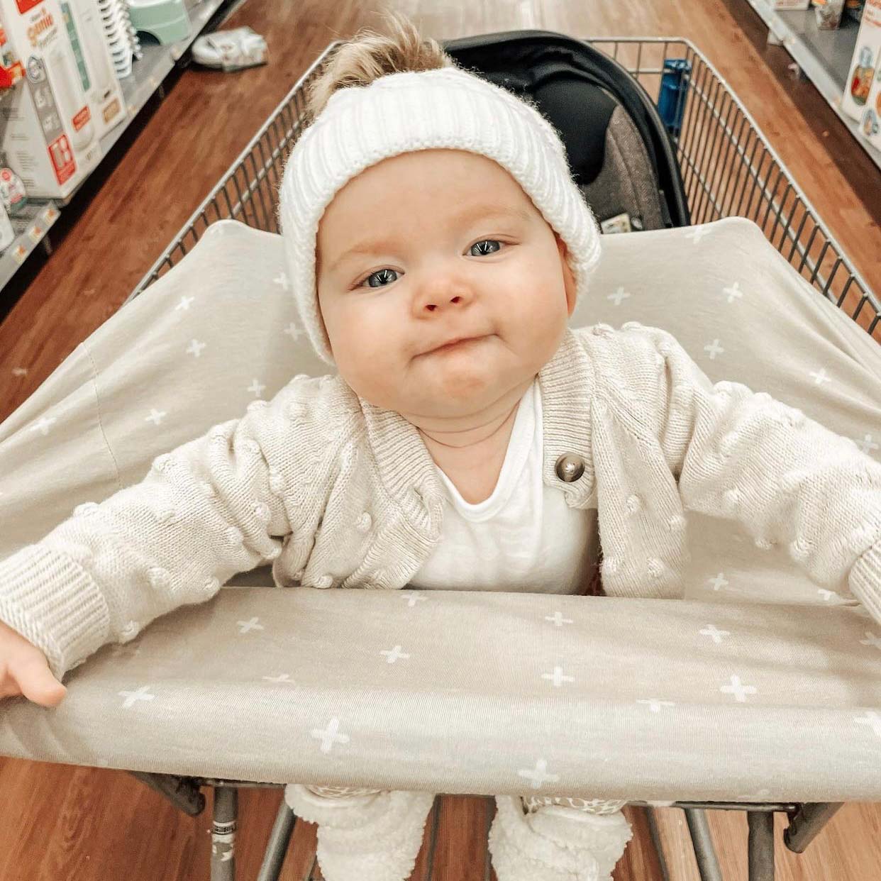 Bring the Sage Windowpane Cover with you to the grocery store and stretch it over your grocery cart seat - your baby will feel more comfortable, and you won't have to worry about germs. You can even pull our covers over your baby's high chair during mealtimes to catch all that food mess. Just toss in the wash for easy cleanup!