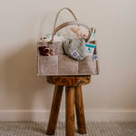 Oatmeal Felt Diaper Caddy: Practical & aesthetic diaper caddy with long handles, a removable insert, & 8 exterior pockets