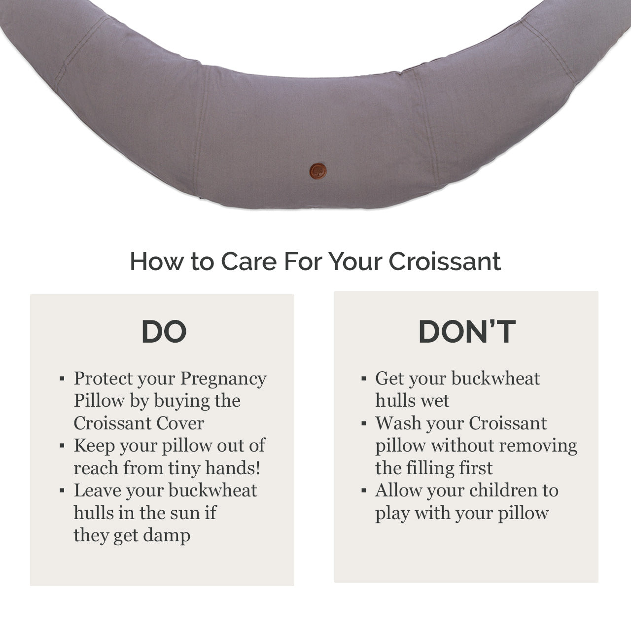 Meet the Croissant: the only pregnancy pillow on the market designed to surround you with support as your body changes. Filled with 100% natural buckwheat hulls, you don't have to worry about the fine print as your baby grows. And protected with our water-resistant Cover, caring for your Croissant is hassle-free. Our innovative maternity pillow features:
