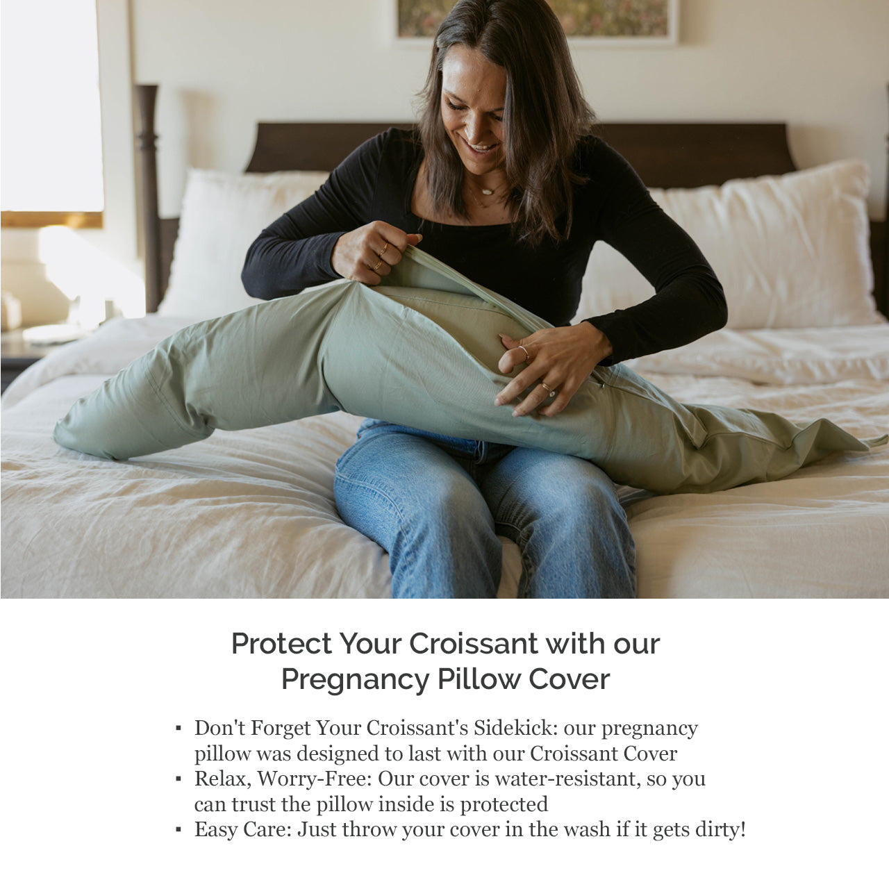 Protected by our water-resistant 100% cotton Croissant Cover, our pregnancy pillow is easy to care for and long-lasting. Just take off your cover and toss it in the wash for a quick refresh! Our Cover also features a functional snap and loop design on either end, so you can sling your Croissant over your shoulder as you carry it from room to room.