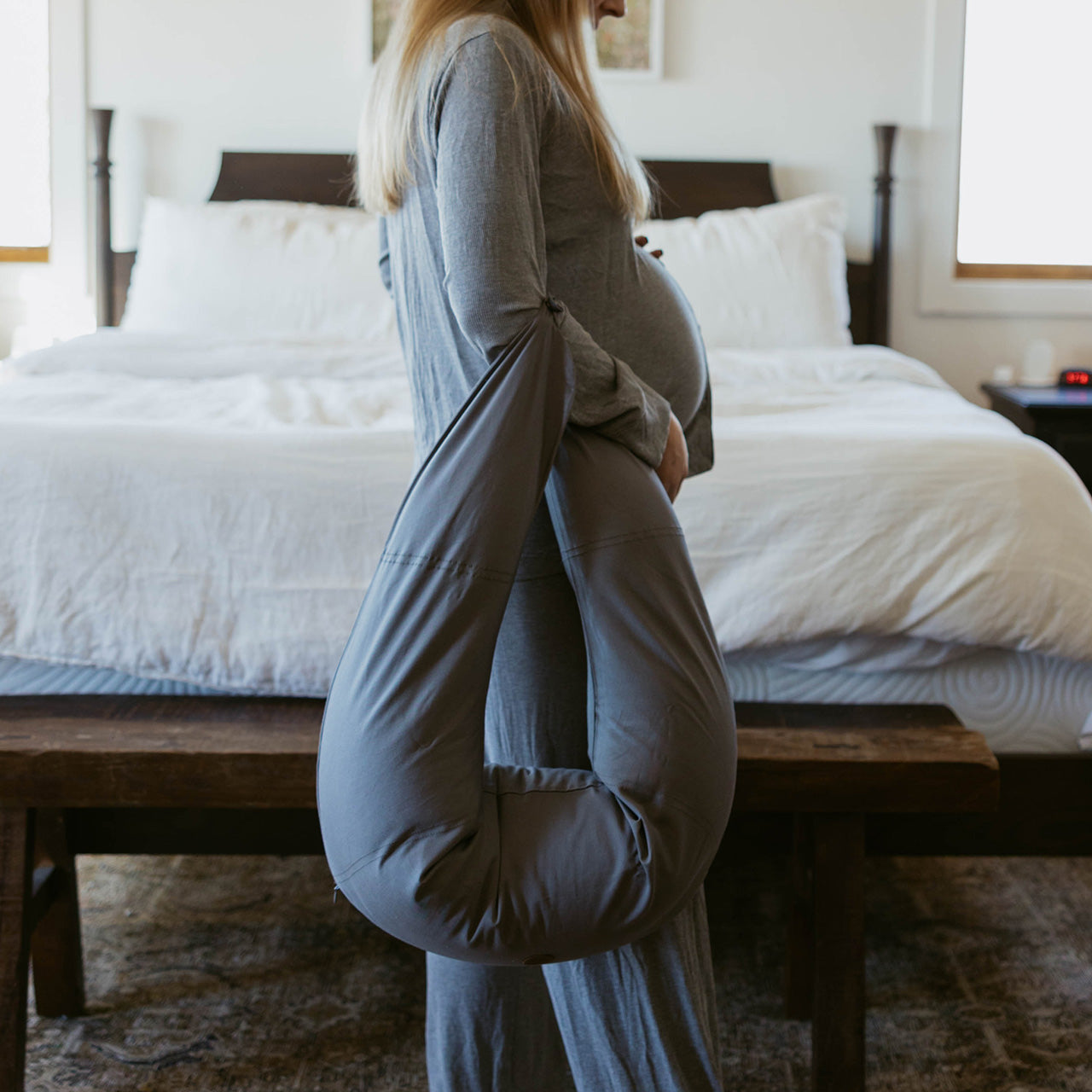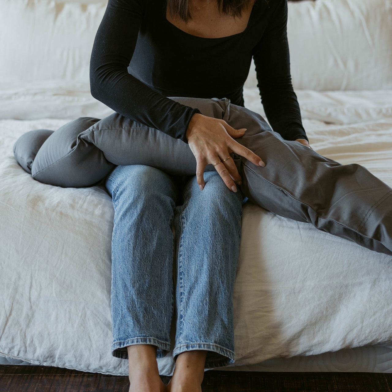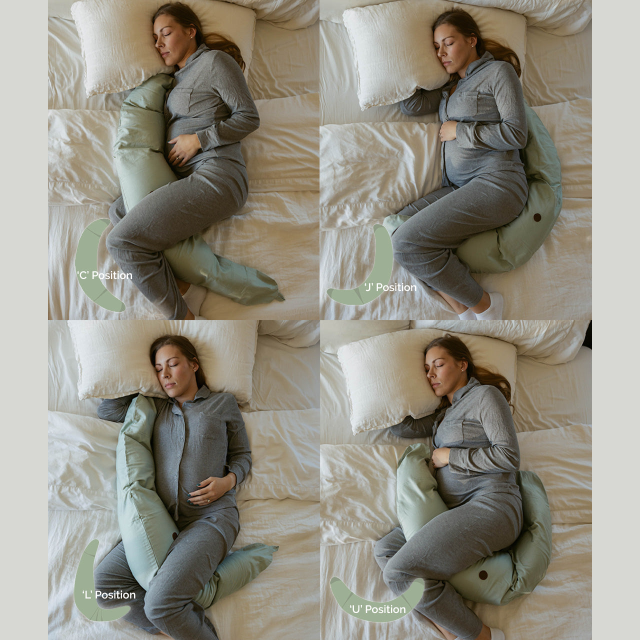 The Croissant isn't like the oversized, flimsy, and unsupportive pillows already on the market. Designed by a mom, for moms, it's exactly what your body craves through every trimester. Our innovative buckwheat hull filling flows freely through The Croissant, allowing you to fold it and mold it into 8+ comfortable positions.